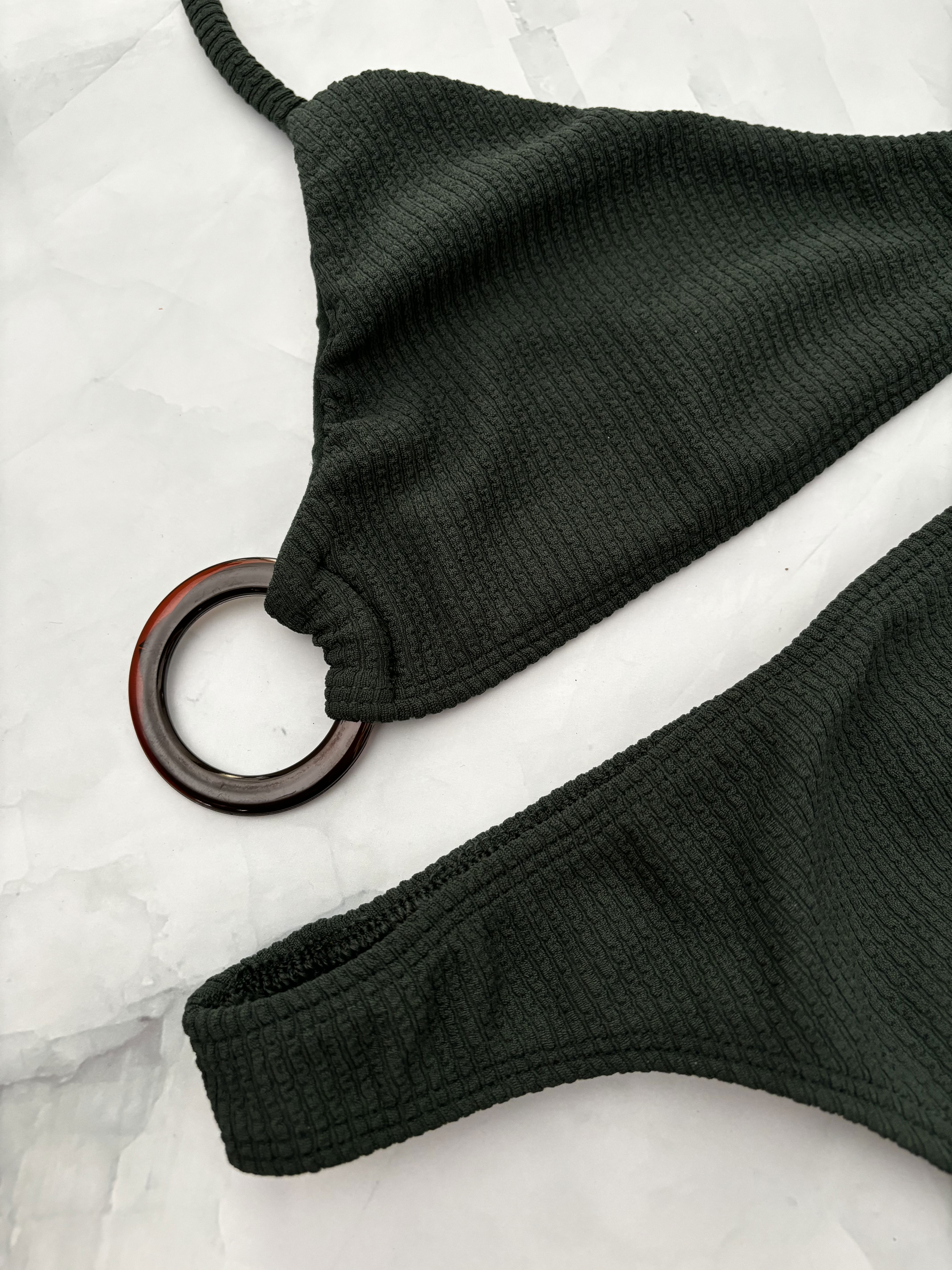 Corpiño tipo top con argollas de carey y tiras para atar. Bombacha semi vedetina.